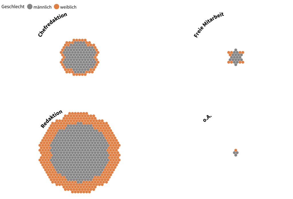 Um eine Repräsentation der Geschlechterverhältnisse in den unterschiedlichen Onlinepublikationen zu ermitteln, sind wir folgendermaßen vorgegangen: Da das Sample, wie bereits beschrieben, 265 Onlinemedien umfasst, wurden die jeweiligen Nachrichtenseiten, aus Gründen der übersichtlicheren Visualisierung und generellen Repräsentation, einer Überkategorie zugewiesen. Diese Kategorien, welche im Groben den Ressorts entsprechen, wurden den Onlinemedien nach eigenen Angaben des Impressums oder anhand einer Überzahl von ressortbezogenen Artikeln zugeordnet.