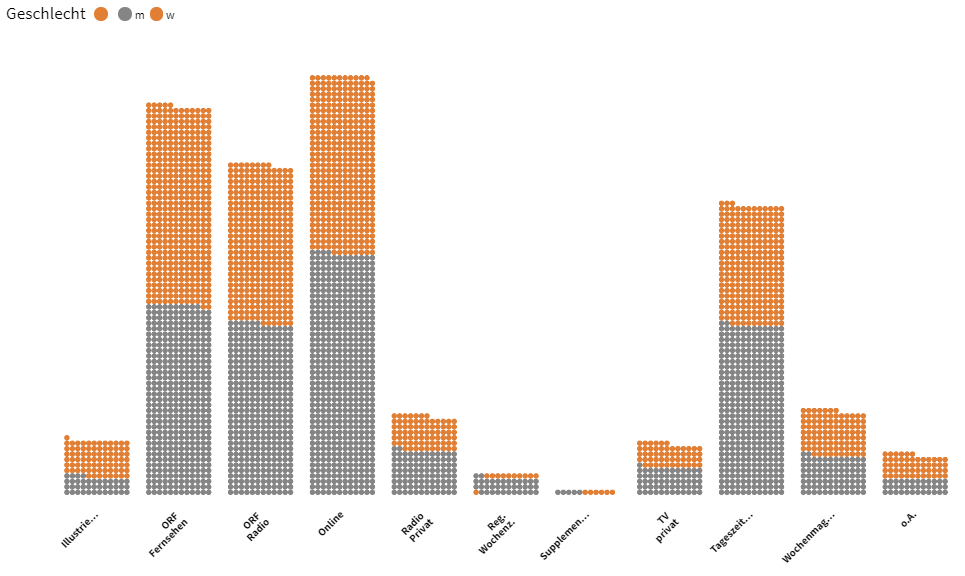 Das oben stehende Diagramm zeigt die Geschlechterverteilung in verschiedensten Medienkategorien. Im Printbereich unterschieden wir dabei zwischen Illustrierten Magazinen, Wochenmagazinen, Regionalen Wochenzeitungen, Supplements am Wochenende sowie Tageszeitungen. Dabei zeigt sich, dass vor allem regionale Wochenzeitungen sehr stark männlich dominiert sind. Auch bei den Tageszeitungen lässt sich noch eine Mehrheit an Männern feststellen. Während Wochenendbeilagen und Wochenmagazine etwa gleich viele Journalistinnen wie Journalisten beschäftigen, sind illustrierte Magazine (Erscheinungstermin 14-tägig oder seltener) die einzige Kategorie, in der Frauen in der Überzahl sind.