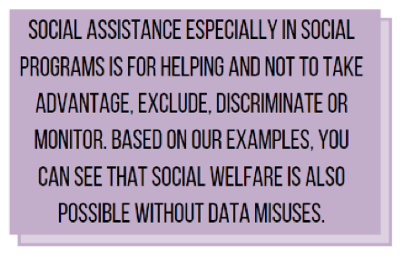 the extent and purpose of data that is being asked of them. This collected data includes a range of information, from biometrics to social media monitoring. Then it can be shared with multiple government agencies and private stakeholders, it can be used for crime investigation, or it can even be posted online for transparency reasons.[3] This can lead to the compromisation of personal information, making beneficiaries susceptible to scams. It can also be used for crime investigation, making people who have been registered in social programs more represented in crime databases.[4]