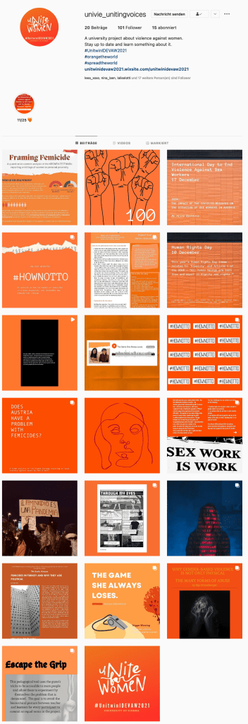 The output contains eleven exciting projects, which can now be seen on the collaborative website as well as the Instagram channel @univie_unitingvoices. It includes two frame analyzes, a wide variety of case studies and multimedia discussions of particular issues. What they have in common is that all of them should raise awareness.